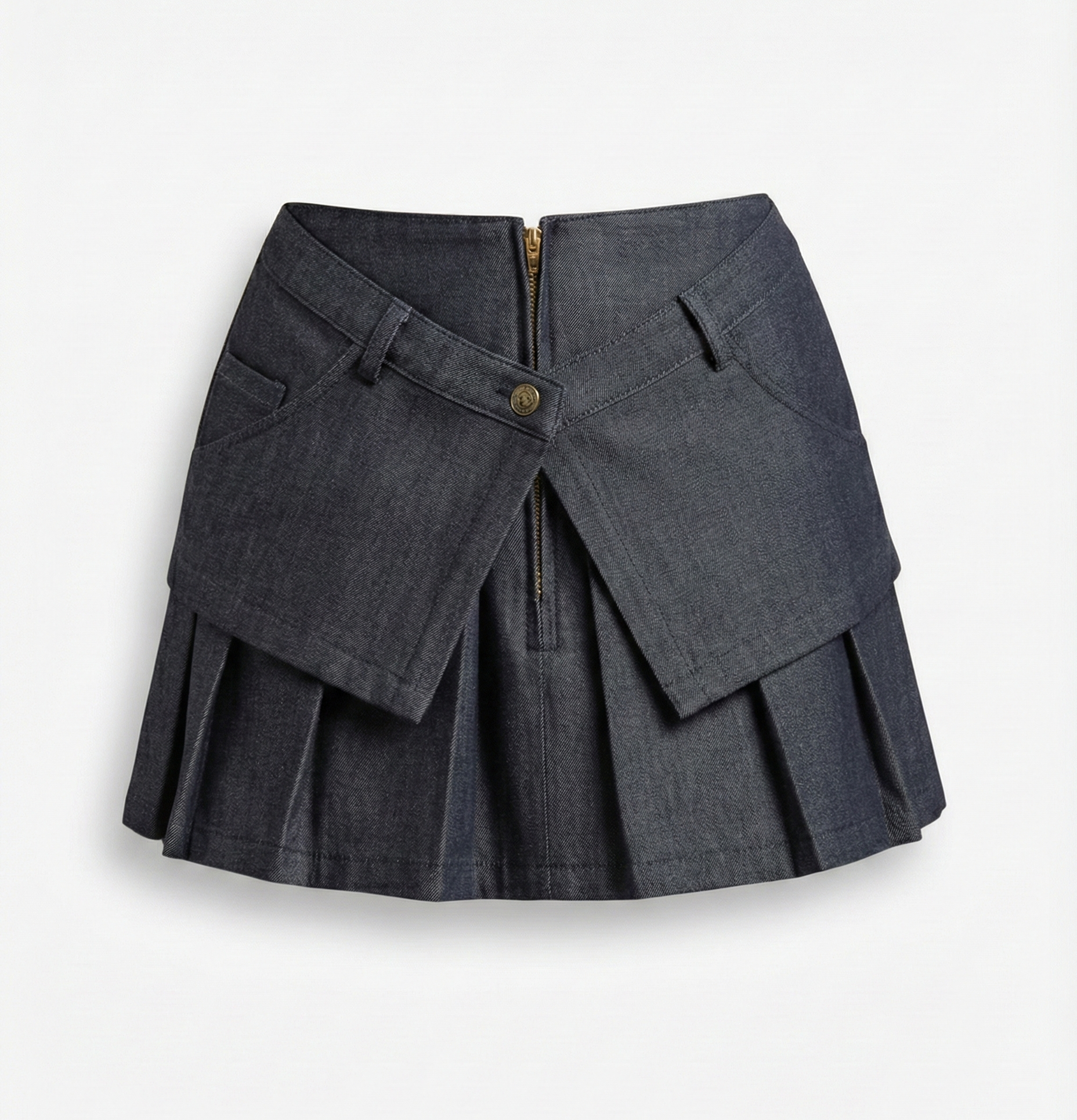 Una de nuestras piezas icónicas es esta falda mini de denim azul, diseñada con
