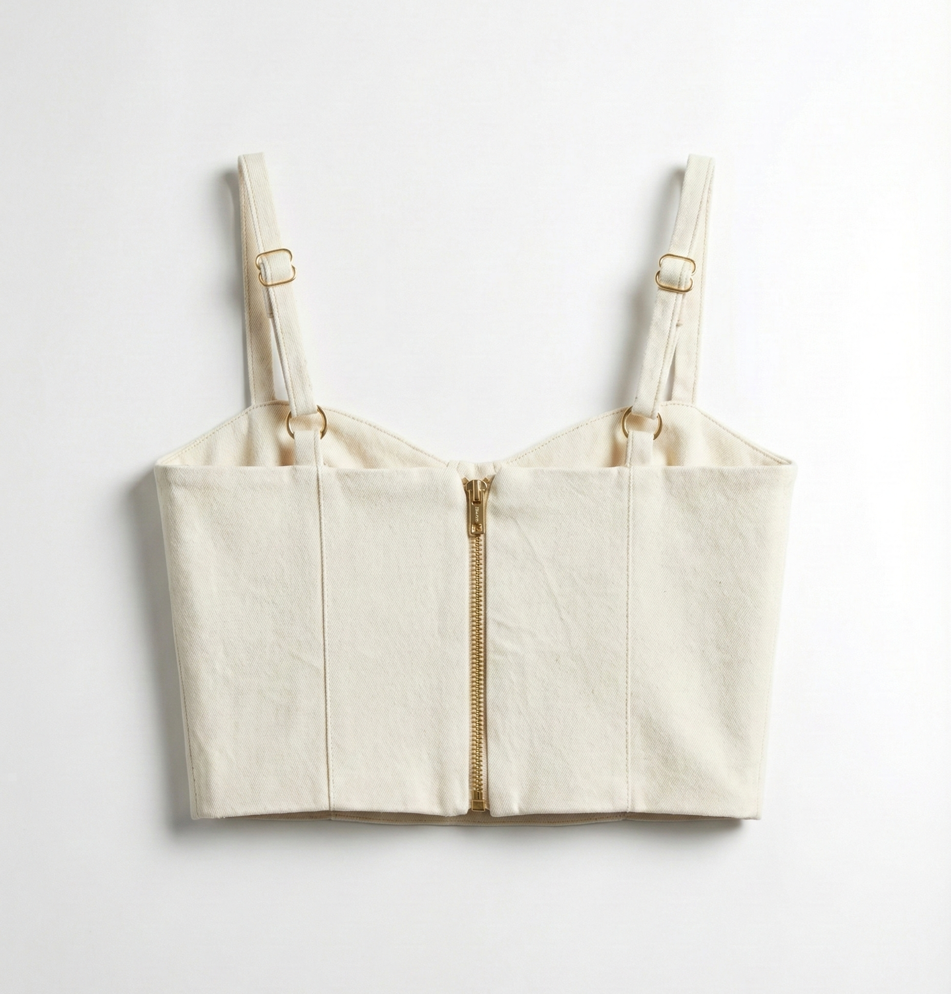 Este top en denim blanco orgánico combina estructura y pureza en un diseño